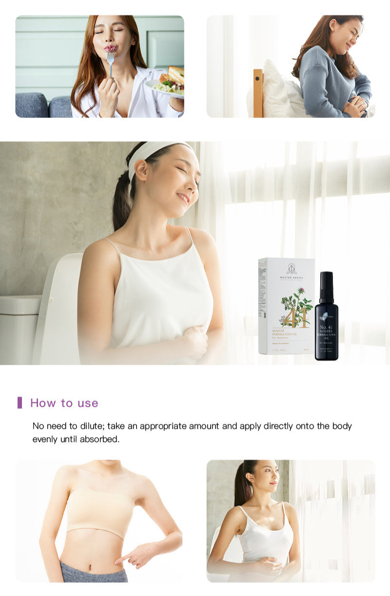- Apply 2–3 drops to the abdominal area, gently massage in circular motions.