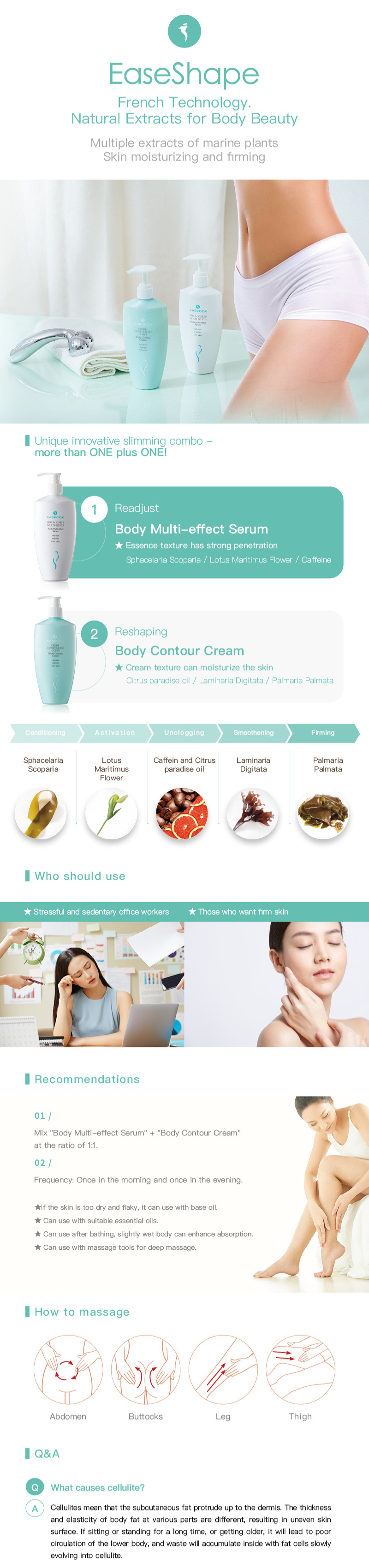 Multiple plant extracts derived using innovative biotechnology for efficient absorption to smooth, firm, and refine stubborn cellulite.