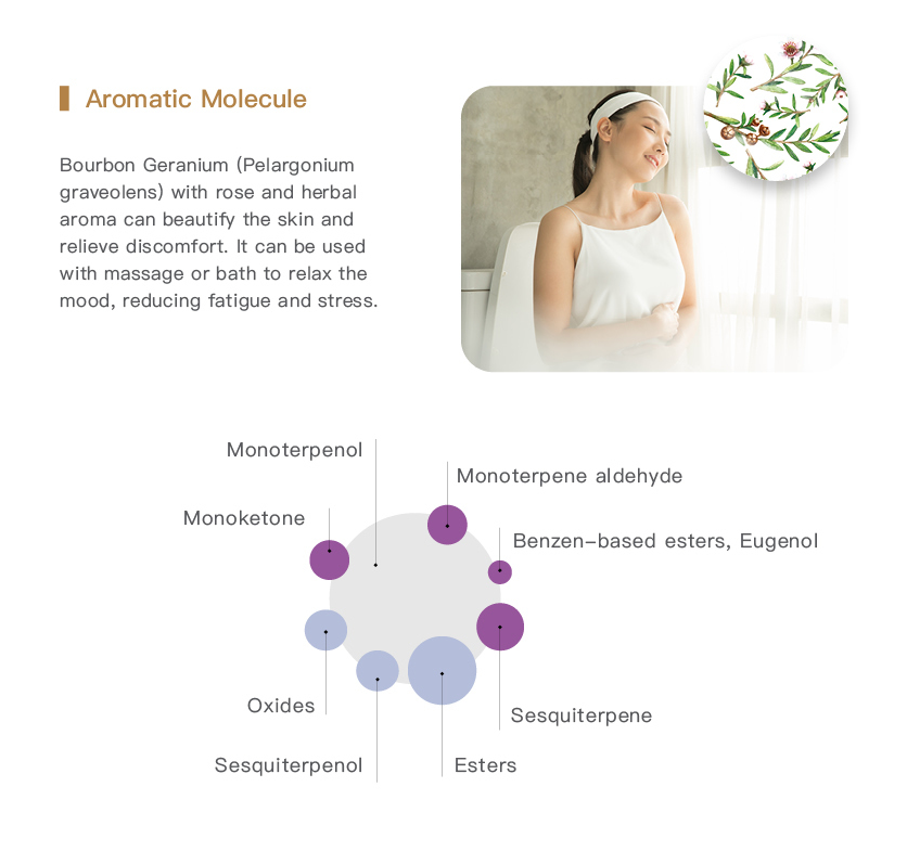 - Geranium Essential oil is good at dealing with imbalances of the body and mind. It is the "balancing oil" in aromatherapy. It is also called the "Poor Man's Rose", as the price of roses is quite high. Geranium has the taste and characteristics of roses, but the price is relatively budgetive to people, it is often used as a substitute for Rose Essential Oil. Among the varieties of geraniums, the few that can extract essential oils are Bourbon and Rose Geranium. The scents of the two are slightly different, the bourbon geranium presents a rich and multi-layered green grass blending floral fragrance.