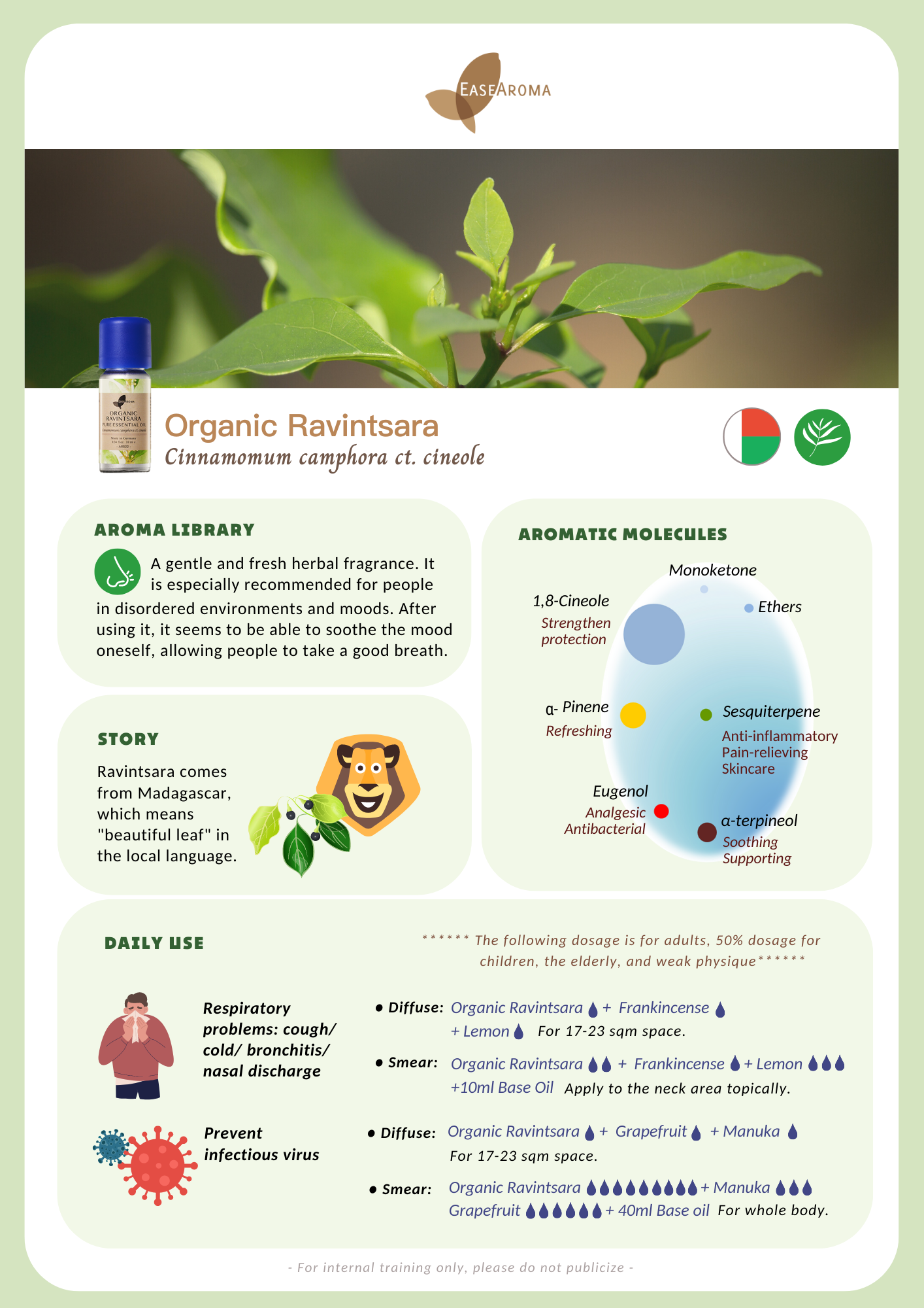 - Ravintsara Essential oil has recently been renamed as "Cineole camphor", which comes from Madagascar. In the local language, "Ravintsara" means "beautiful leaf". Cineole camphor is mainly composed of eucalyptol (1,8-Cineol) is the main ingredient, the content is as high as 50-70%, it has aĀ good performance on anti-infection, anti-virus, treatment of joint pain and muscle weakness.