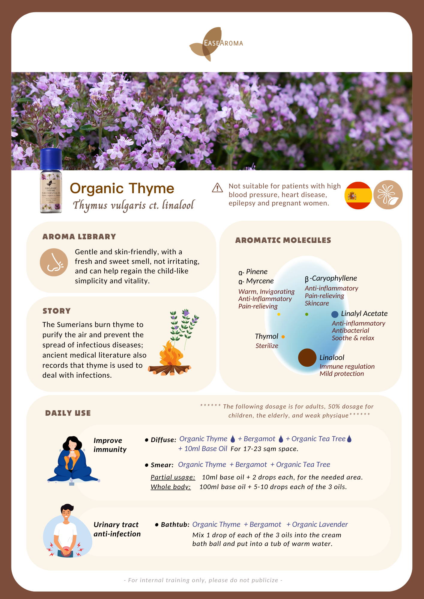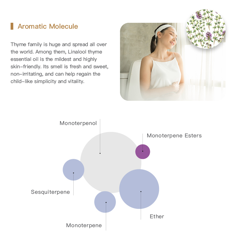 - Thymus vulgaris ct. linalool has been widely used more than 3,000 years ago, and its curative effect is also recorded in the ancient medical texts to deal with various infection problems. Among the Thyme family, Thymus vulgaris ct. linalool is the mildest and has multiple curative effects. It can be used for a long time to boost the Immune system. The smell is fresh and sweet, suitable for children and the elderly. It helps infections such as ear, nose and throat problems caused by a cold, gastroenteritis, cystitis. It is also suitable for mixing with other Essential oils for a synergistic effect.