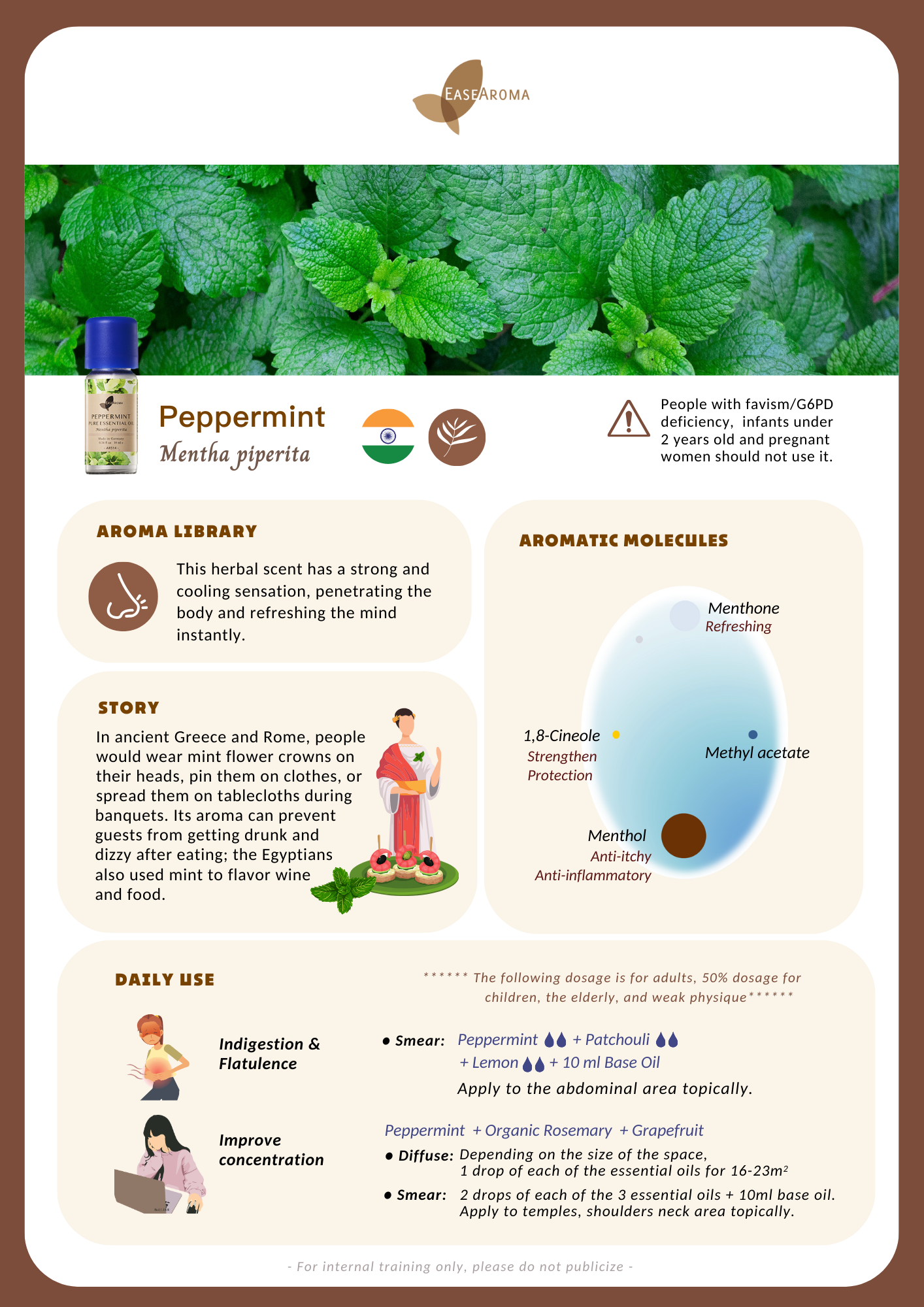- Peppermint is also known as a "plant of fortune" in the West, and it symbolizes good luck and fortune. It is a perennial herb and its essential oil is also frequently used in aromatherapy. Throughout history, it has been used extensively in everyday life, such as a remedy against gingivitis, toothache, abdominal pain, bloating, headache, dizziness, and also has a very refreshing and soothing effect. The cool, herbal aroma and cooling sensation of peppermint comes mainly from the "menthol" component, which has been proven to have a calming effect on pain.